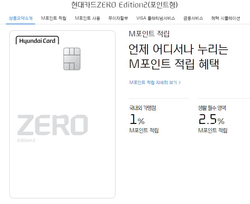 현대카드 zero edition2 (포인트형) 카드는 할인 횟수와 한도 제한 없이 모든 가맹점에서 이용 대금의 1.0% M포인트 적립이 제공됩니다. (국내외 가맹점은 현대카드 가맹점 등록기준임)